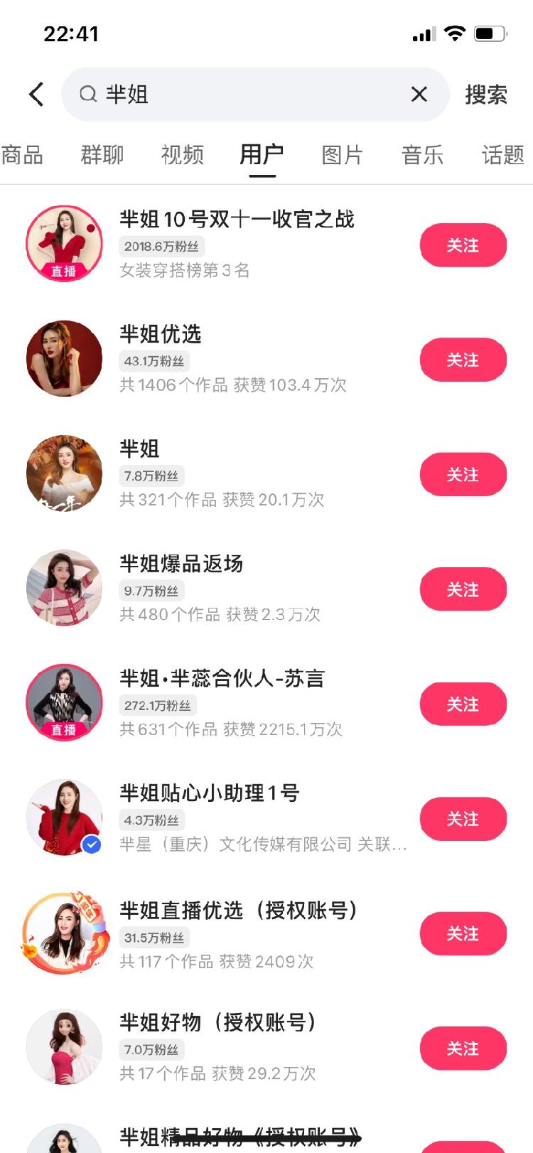 网红主播的分身号更为普遍。芈姐是一位快手上粉丝超过2000万的服装带货主播,拥有自己的服装品牌。除了其主账号外,记者在平台上搜索关键词“芈姐”,能找到“芈姐爆品返场”“芈姐好物”“芈姐直播好物”等上百个大大小小的账号,其中多个账号的页面介绍写着“账号已获得官方授权”等信息,并声称小店商品均为相应明星、网红直播间同款专属链接。