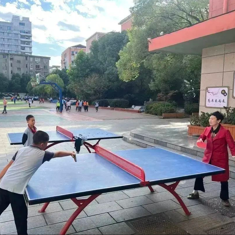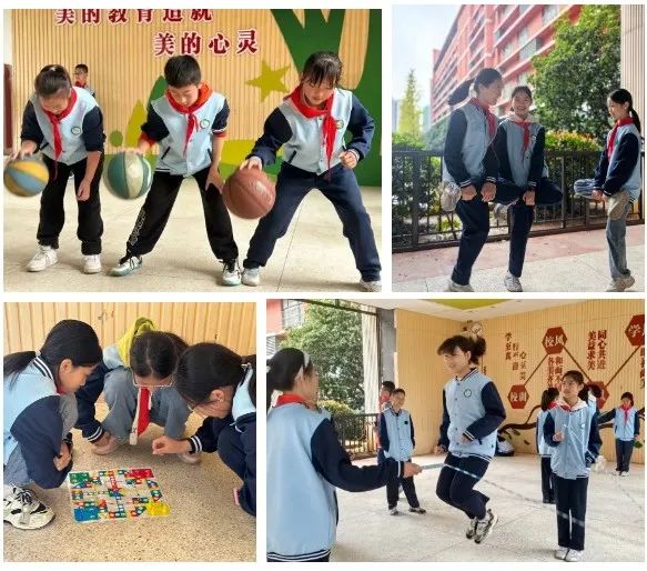 南昌市青新小学教育集团青新校区:“叮铃铃……”下课铃响,师生来到操场,一起解锁跳花绳、打乒乓球、打篮球、丢沙包等游戏。