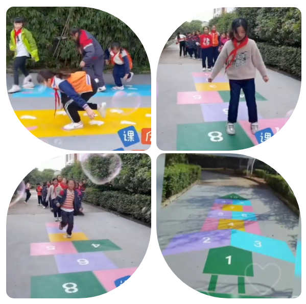 南昌市青山湖区佛塔小学:学校把校园里的小道铺成了色彩缤纷的“游戏路”,格外吸引学生。一下课,孩子们便会组队来玩,还自创了多种玩法,愉悦身心。