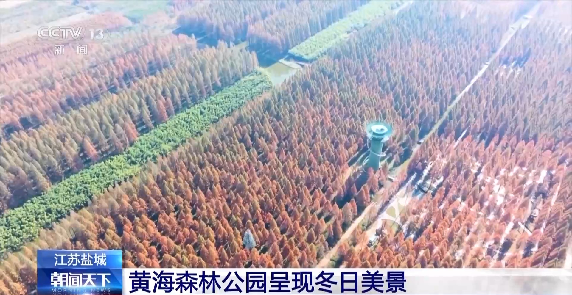 在江苏盐城的黄海森林公园,成片的树林经历夏季的翠绿、秋季的换装后,眼下正是一片橙黄橘绿。绵延起伏的各色树木,犹如打翻在大地上的调色板。排列整齐的树木则像是一匹匹流光溢彩的锦缎,在湛蓝天空映衬下,为大地穿上美丽的衣装。