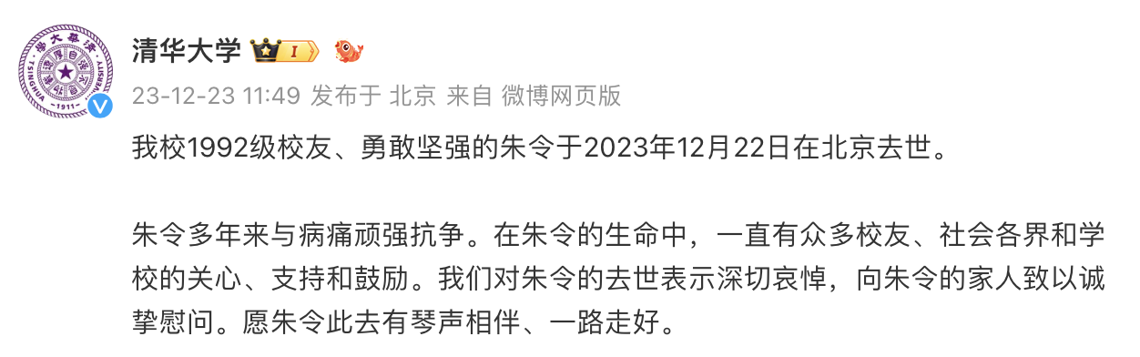 朱令多年来与病痛顽强抗争。在朱令的生命中,一直有众多校友、社会各界和学校的关心、支持和鼓励。我们对朱令的去世表示深切哀悼,向朱令的家人致以诚挚慰问。愿朱令此去有琴声相伴、一路走好。