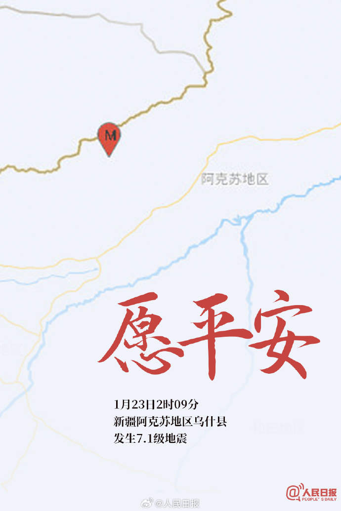 中国地震台网正式测定:1月23日02时09分,在新疆阿克苏地区乌什县(北纬41.26度,东经78.63度)发生7.1级地震,震源深度22公里。