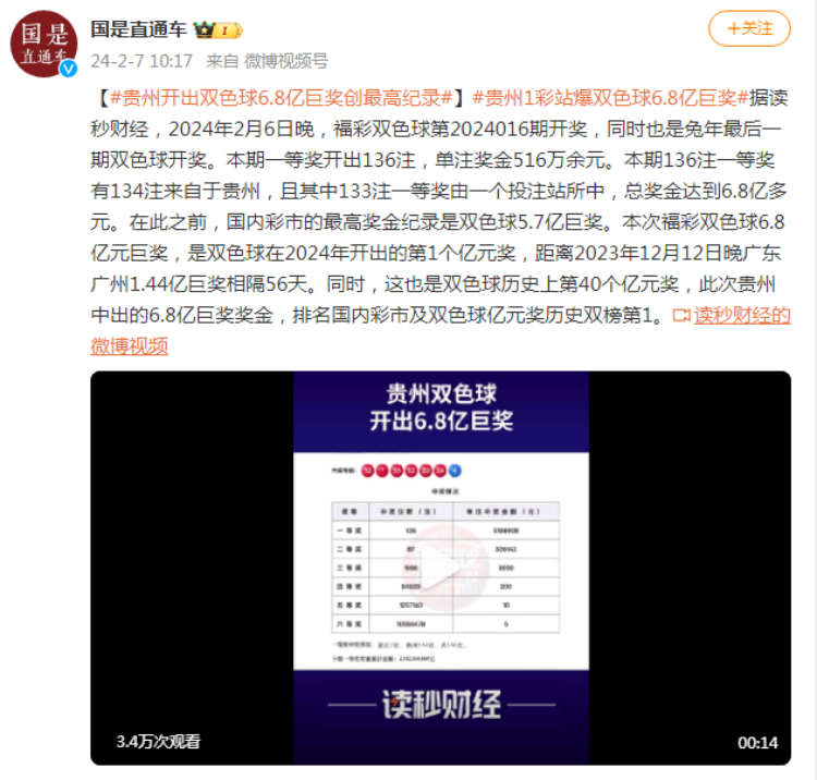贵州开出双色球6.8亿元巨奖,创国内彩市最高奖金纪录