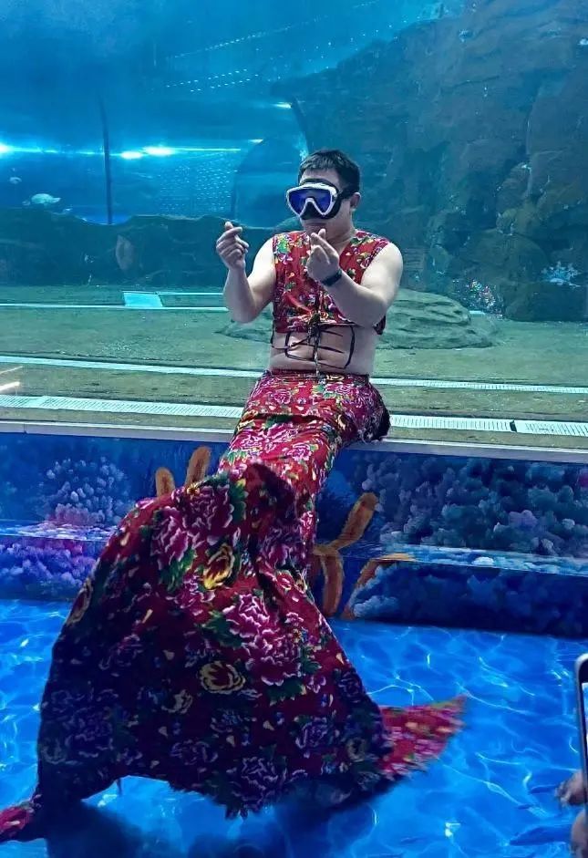 男子穿“大花”扮美人鱼走红,网友戏称“美肚鲨”