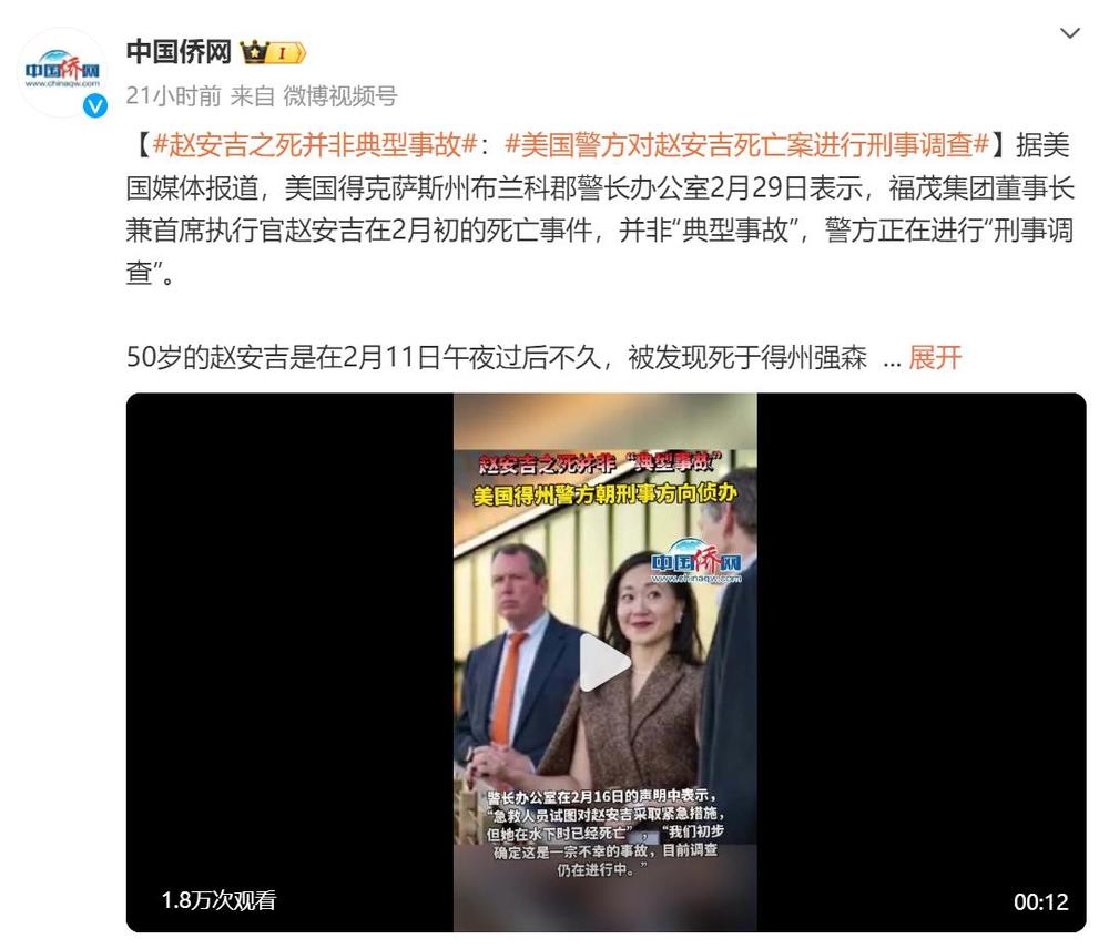 据@中国侨网援引美国媒体报道,美国得克萨斯州布兰科郡警长办公室2月29日表示,福茂集团董事长兼首席执行官赵安吉在2月初的死亡事件,并非“典型事故”,警方正在进行“刑事调查”。