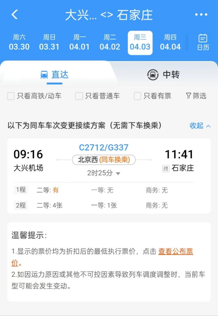 目前北京西站已有部分车次支持“同车换乘”,如从大兴机场站到石家庄站等方向不需要再更换列车。