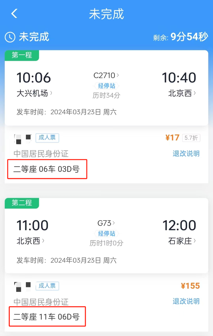 记者在12306APP车票支付页面了解到,系统在售票时暂不能实现两段行程分配同一个座位,旅客买到的仍是两张车票的随机座位,需要自行根据车票更换座位。