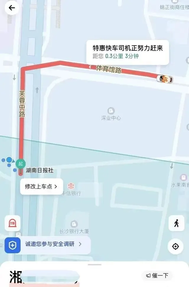 而在一名长沙网友晒出的打车进程中,接驾司机的行驶路段已经变成了显示拥堵的红色。