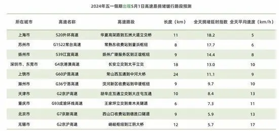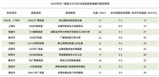 《2024年五一假期出行预测报告》显示,从全国高速出程易拥堵路段分布来看,出程易拥堵路段主要出现在东部地区。最易拥堵路段是上海市S20外环高速(华夏高架路到五洲大道立交桥)段,全天平均速度仅为5千米/小时。