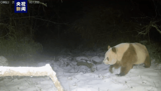 画面中棕色大熊猫先是被夜晚红外相机拍摄时的亮光吸引。在附近徘徊片刻后,又被相机近距离捕捉到它在雪地中悠闲踱步的景象。