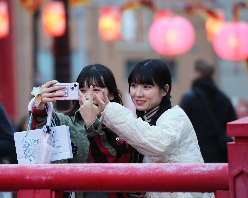 2月14日,在日本长崎,参观龙年灯会的游客自拍留念。新华社记者杨光摄