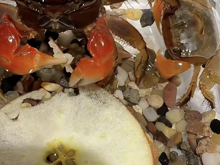 相处几天,小雨找到了养蟹的乐趣,“它们吃东西的时候可爱到爆炸,总是嘎吱嘎吱地嚼,而且还贼能吃。”小雨说,这两只小螃蟹更可爱的地方在于特别喜欢吃水果,“尤其是苹果和西瓜。”