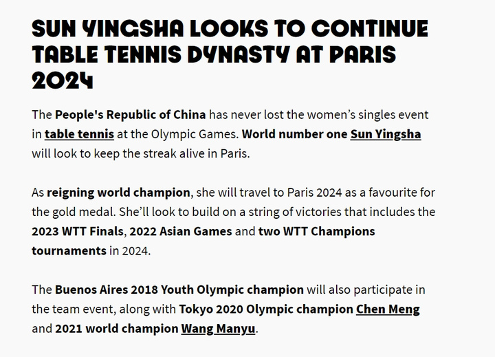 在推荐理由方面,巴黎奥运会官网写道:中国在奥运会乒乓球女子单打比赛中从未丢失过女单冠军,世界排名第一的孙颖莎有望在2024年巴黎奥运会上延续这一纪录。作为世界冠军,孙颖莎将以金牌的热门人选身份前往巴黎奥运会,她将努力在包括2023年WTT总决赛、杭州亚运会和2024年两次WTT冠军赛的胜利基础上再创佳绩。