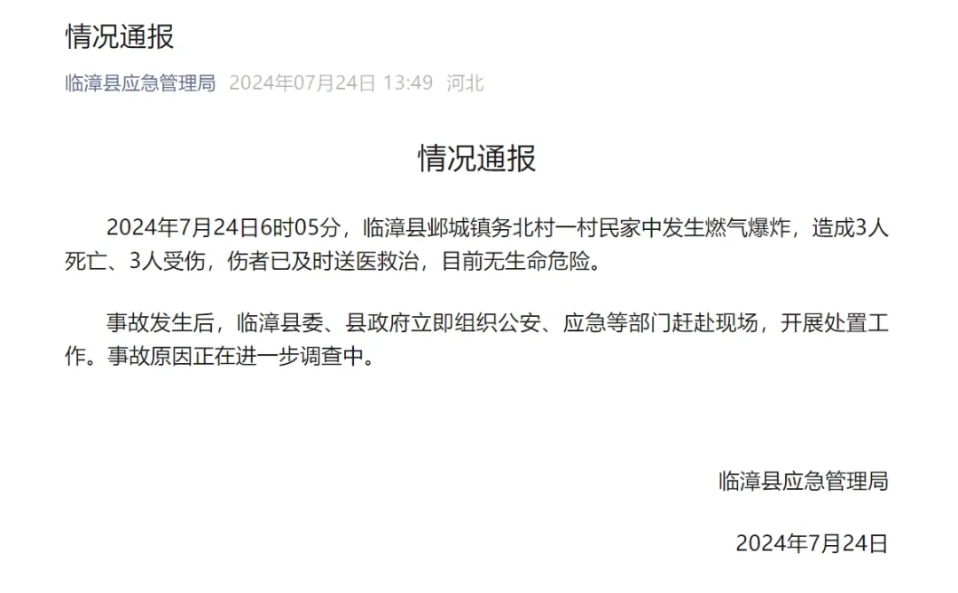 7月24日6时05分,河北省邯郸市临漳县邺城镇务北村一村民家中发生燃气爆炸,造成3人死亡、3人受伤,伤者已及时送医救治,目前无生命危险。
