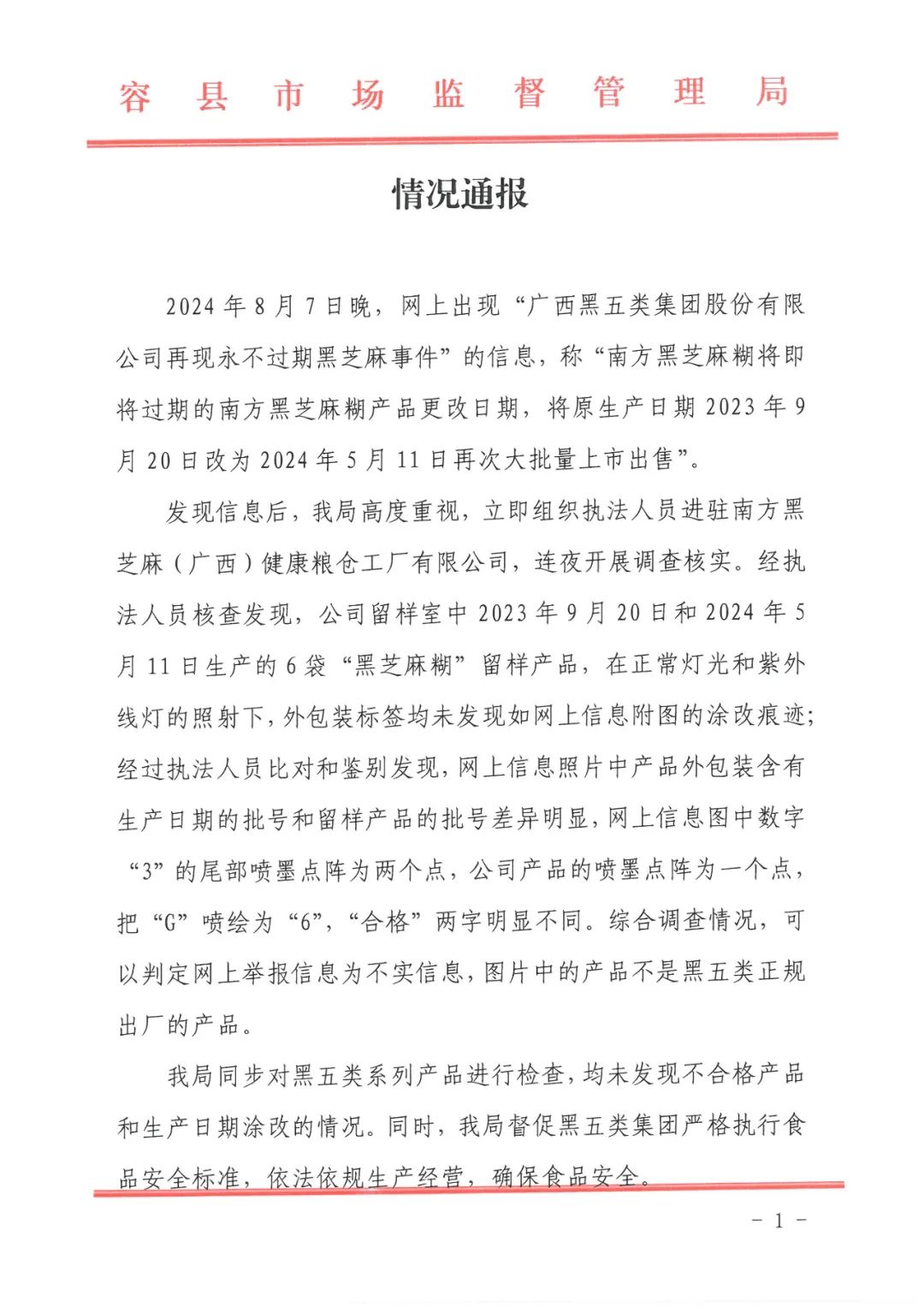 具体来看,情况通报称,8月7日晚,网上出现“广西黑五类集团股份有限公司再现永不过期黑芝麻事件”的信息,称“南方黑芝麻糊将即将过期的南方黑芝麻糊产品更改日期,将原生产日期2023年9月20日改为2024年5月11日再次大批量上市出售”。