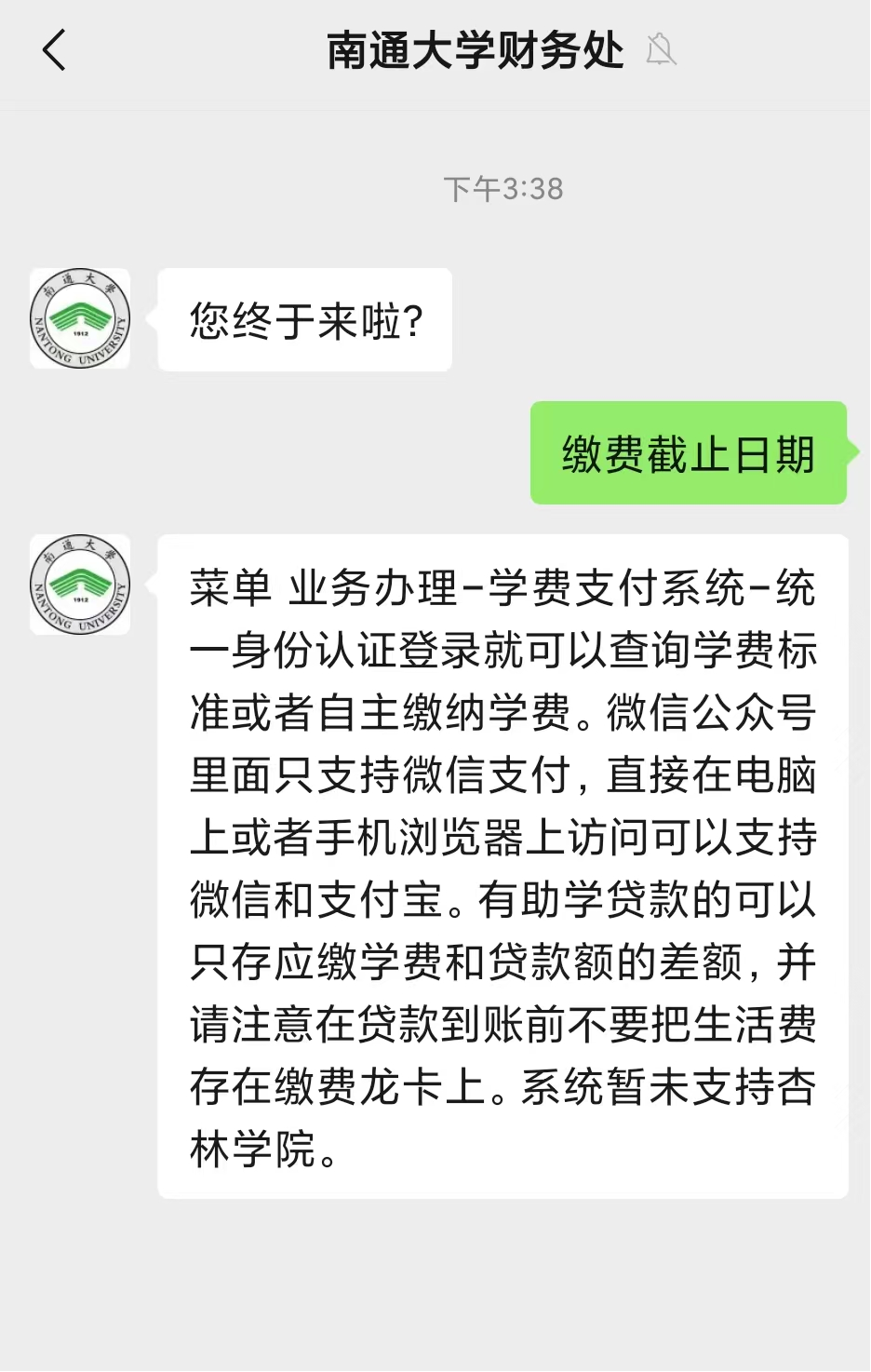南通大学财务处微信公号回复内容截图。图/社交媒体截图