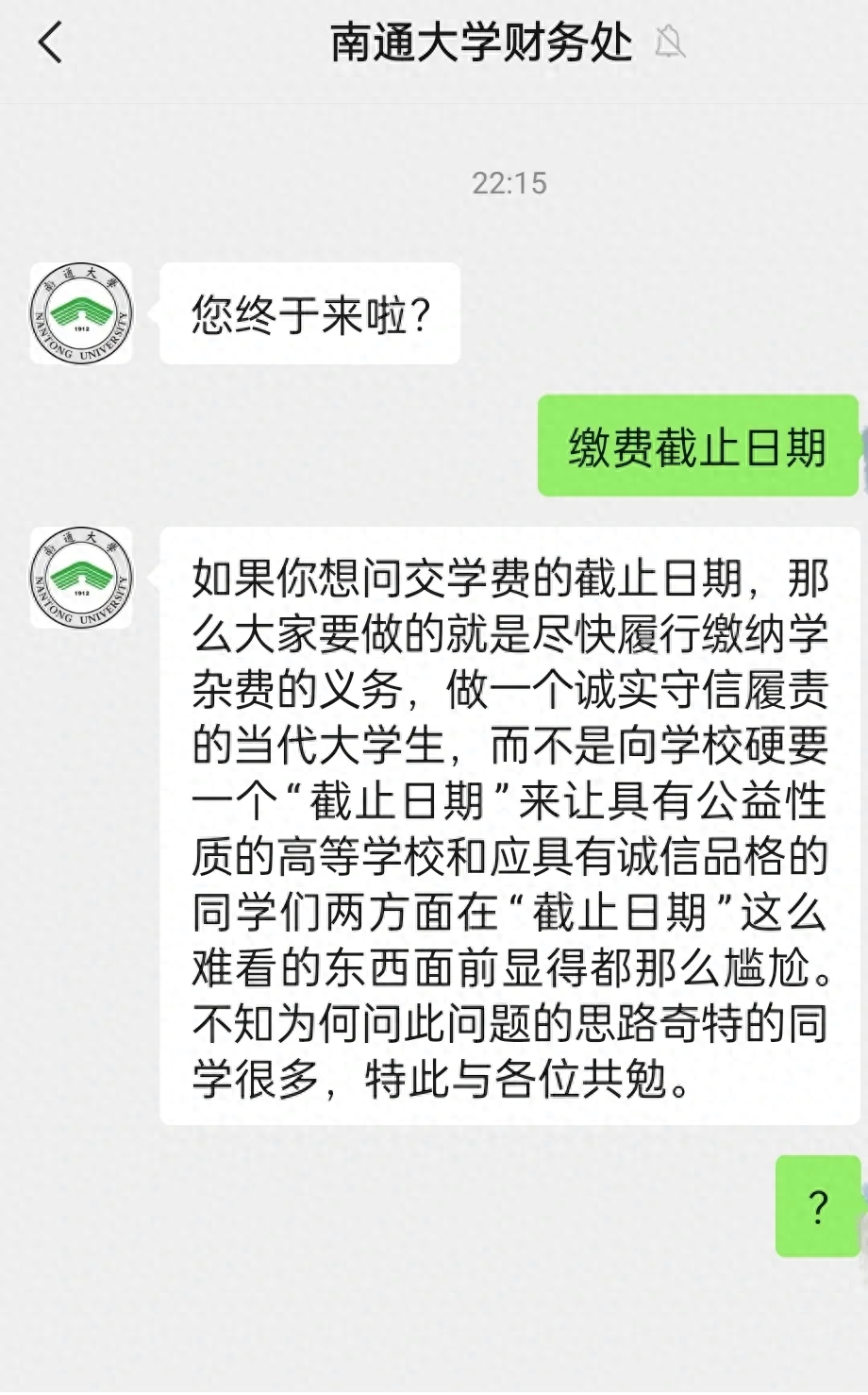 该网友在其微信公号咨询缴费截止日期,但回复内容非但没有明确告知时间,反而指责其不积极缴费,“硬”向学校要截止日期而让双方都显得尴尬,还称咨询此类问题的同学“思路清奇”。