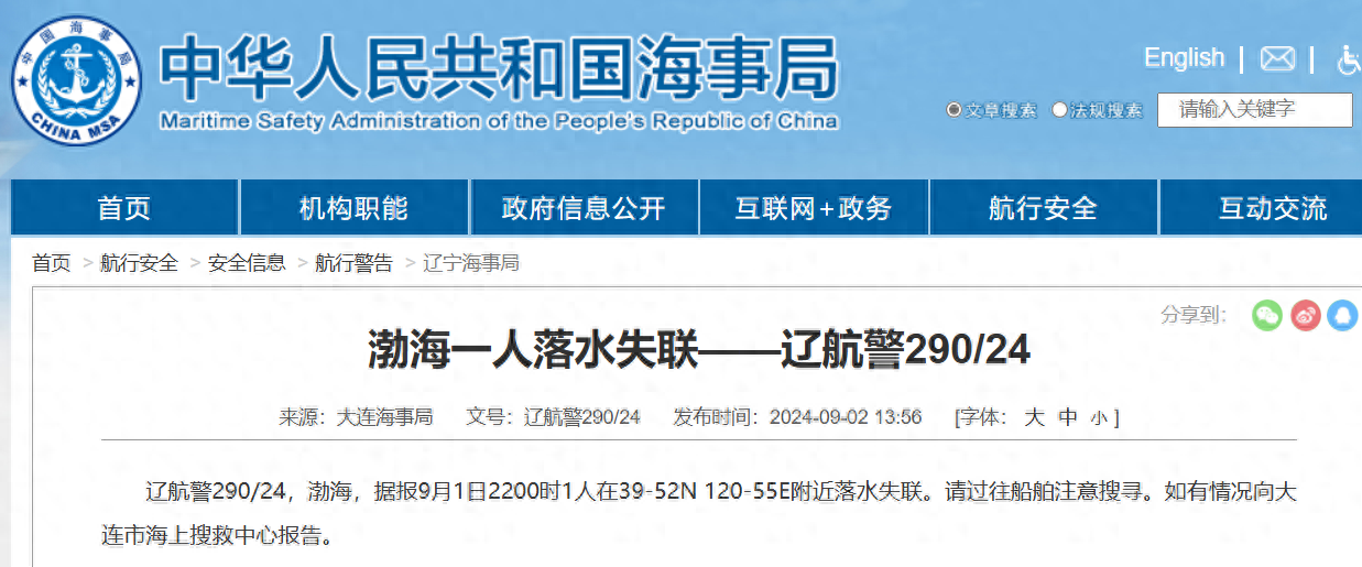 9月2日,据中国海事局网站消息,大连海事局发布航行警告:辽航警290/24,渤海,据报9月1日22时1人在39-52N 120-55E附近落水失联。请过往船舶注意搜寻。如有情况向大连市海上搜救中心报告。
