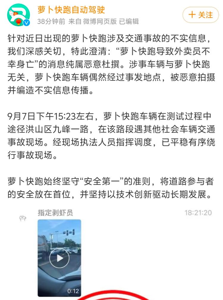9月10日14时许,“萝卜快跑自动驾驶”官方微博发文:“萝卜快跑导致外卖员不幸身亡”的消息纯属恶意杜撰。涉事车辆与萝卜快跑无关,萝卜快跑车辆偶然经过事发地点,被恶意拍摄并编造不实信息传播。9月7日15:23左右,萝卜快跑车辆在测试过程中途径洪山区九峰一路,在该路段遇其他社会车辆交通事故现场。经现场执法人员指挥调度,已平稳有序绕行事故现场。