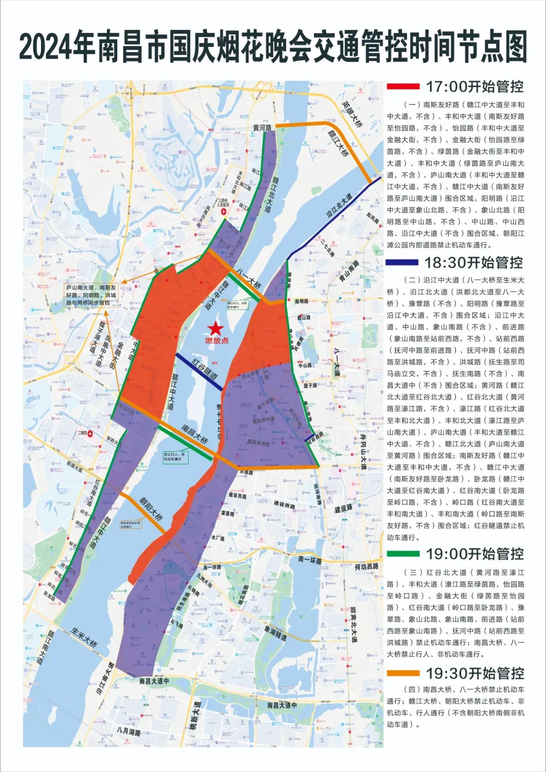 (四)自19:30起,南昌大桥、八一大桥禁止机动车通行,赣江大桥、朝阳大桥禁止机动车、非机动车、行人通行(不含朝阳大桥南侧非机动车道)。