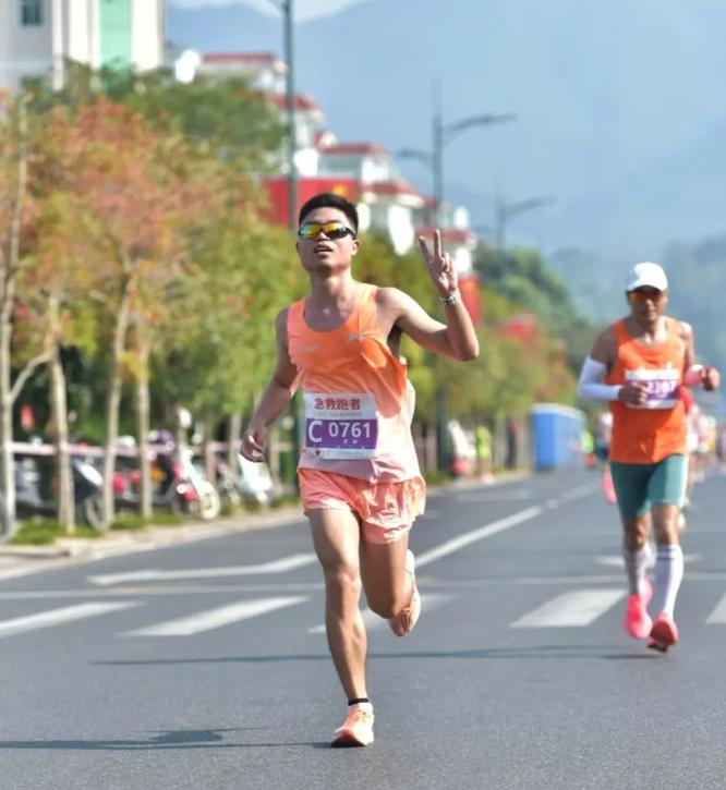 除老兵跑团外,急救跑者队伍同样吸引大众的目光。本次比赛一共配备54名急救跑者作为安全急救员,他们中除25名是半程马拉松跑者外,其余都是全程马拉松跑者。在赛道上,他们放弃自己的配速,关注赛道上的其他跑者状况,发生意外时第一时间进行处理。来自湖南株洲的邓理事就是他们当中的一员。