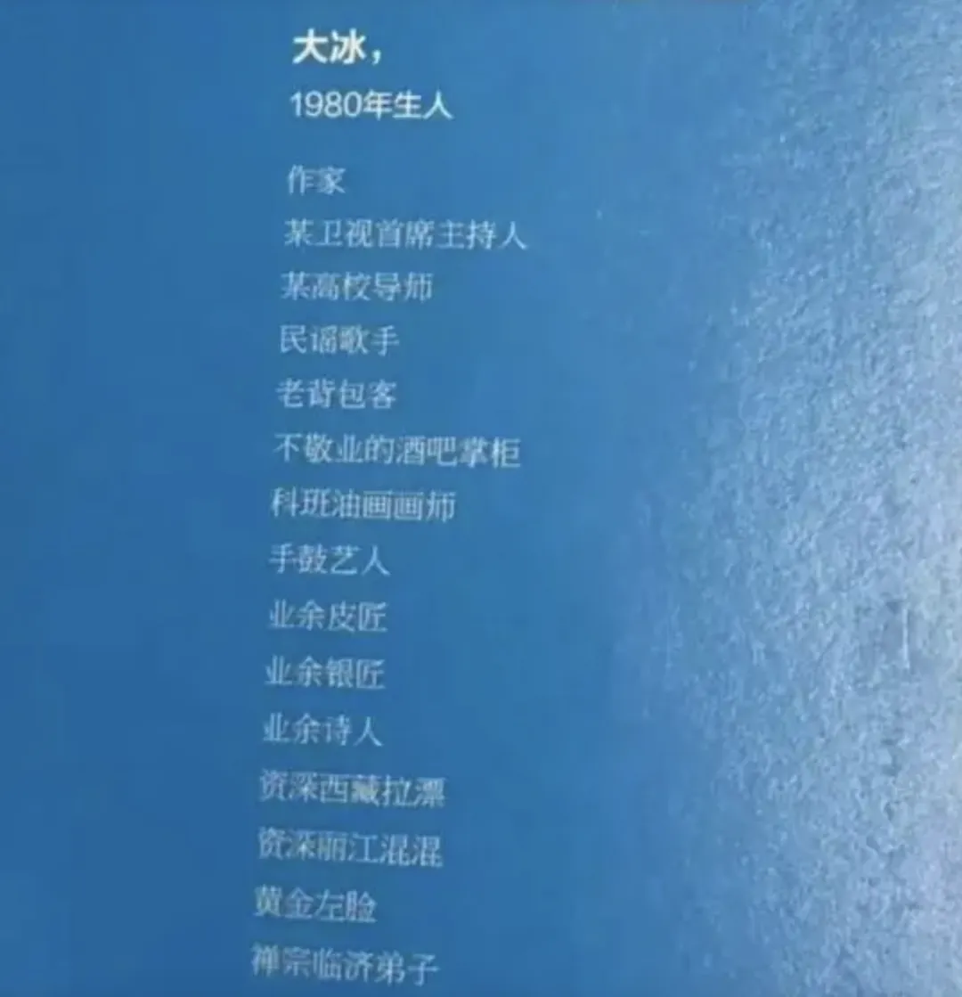 比如,部分网友重新翻出大冰过往的作品,以一种全新的视角开始审判,认为其书名不知所云,内容空洞、矫情、做作、鸡汤味浓重,有些故事被指责为套路化和重复化。尤其是他给自己贴的“作家/某卫视首席主持人/某高校导师/民谣歌手/老背包客/不敬业的酒吧掌柜/科班油画画师/手鼓艺人/业余皮匠/业余银匠/业余诗人/资深西藏拉漂/资深丽江混混/黄金左脸/禅宗临济弟子”——长达十几个前缀的身份标签,成为最大的调侃对象。甚至这种罗列身份标签的方式被称为“冰学”