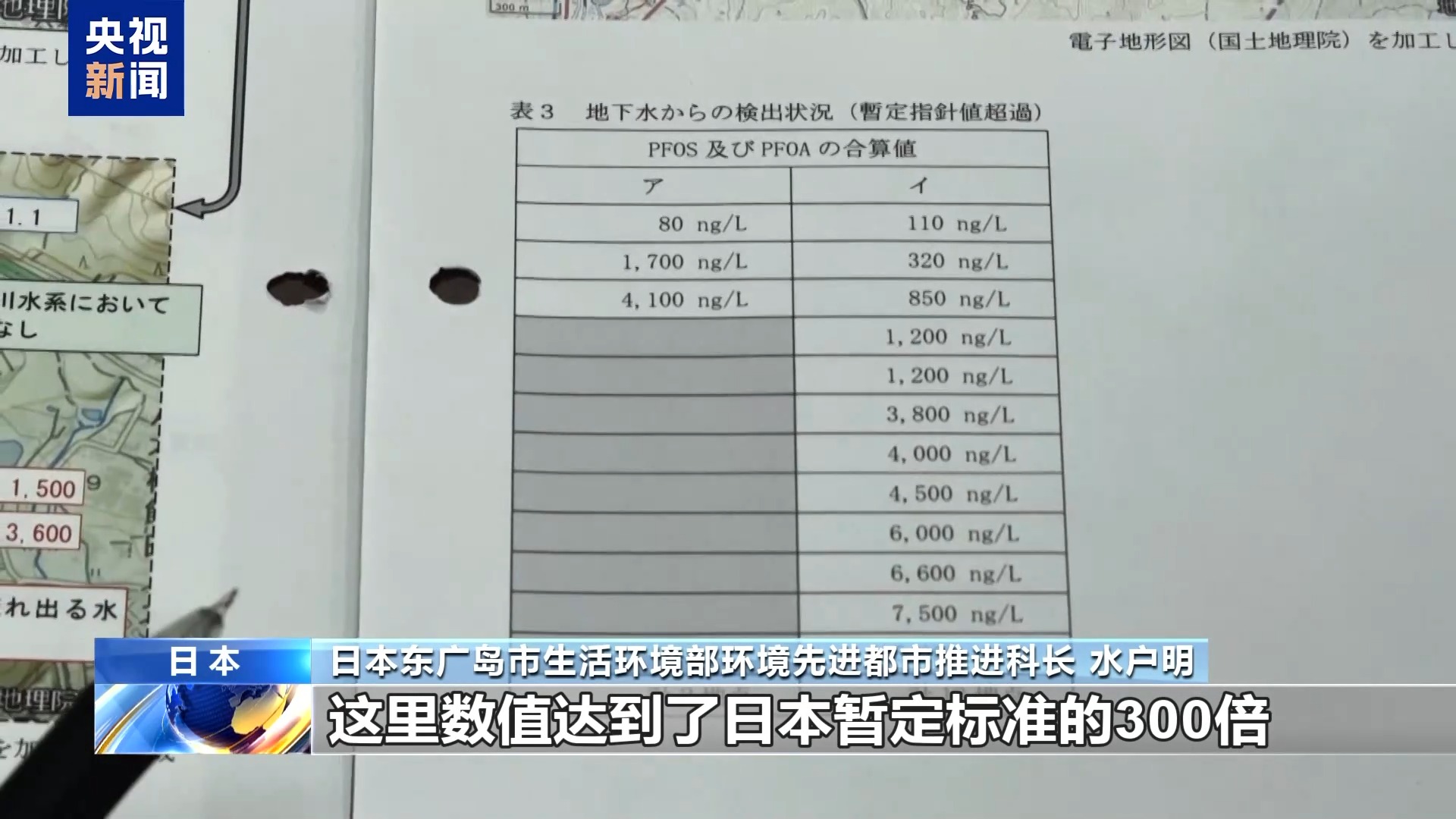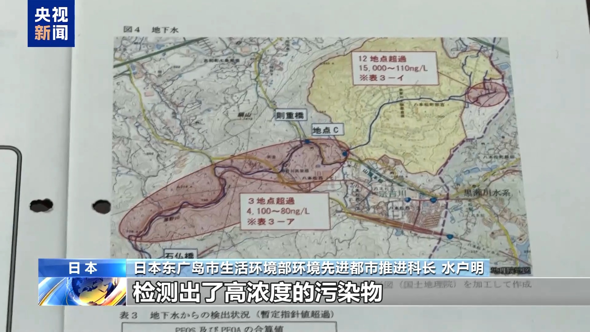 日本东广岛市生活环境部环境先进都市推进科长 水户明:这是濑野川的流向。在驻日美军弹药库的南边和东北方,检测出了高浓度的污染物。日本的暂定标准是每升50纳克。