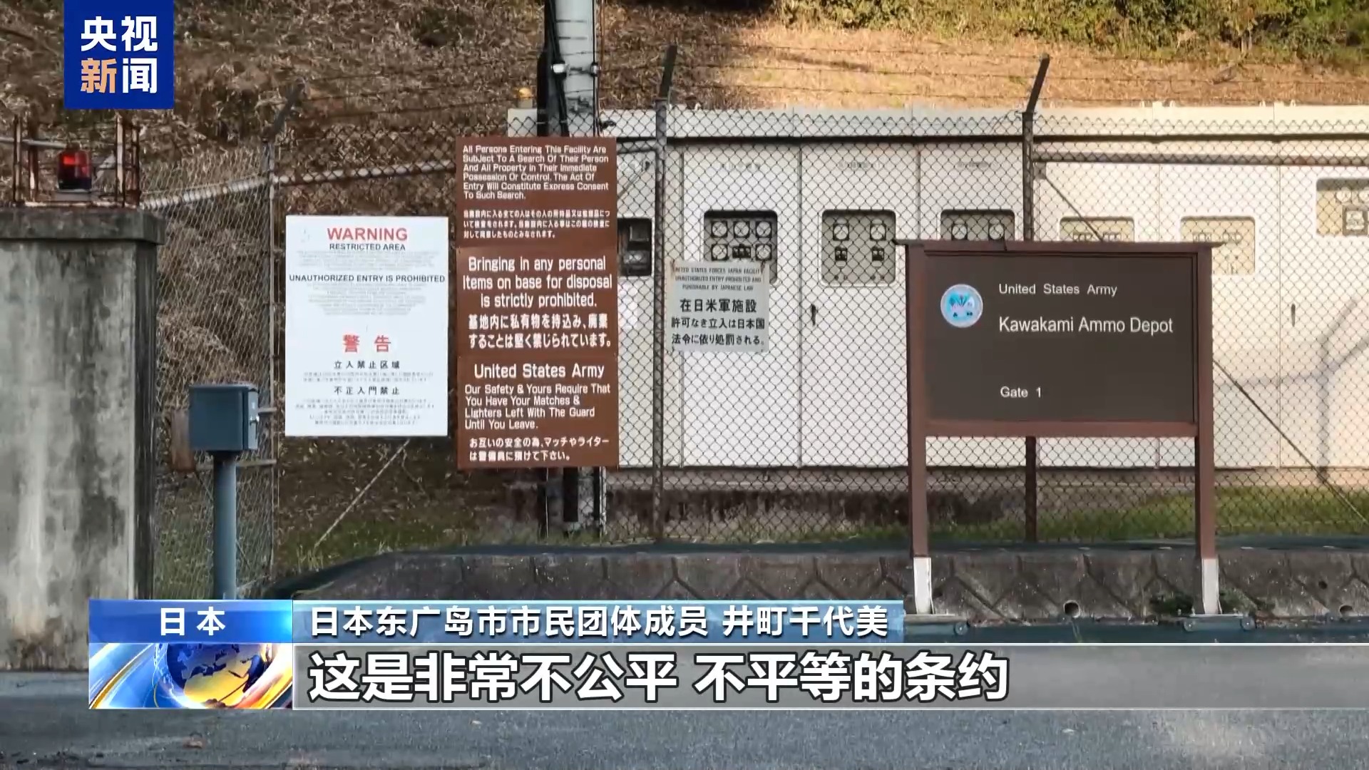 东广岛市居民:我们从小就在这样的环境里长大,被教育围墙里面的是美国。基地门口的牌子上清楚地写着,日本的法律在美军基地不通用。