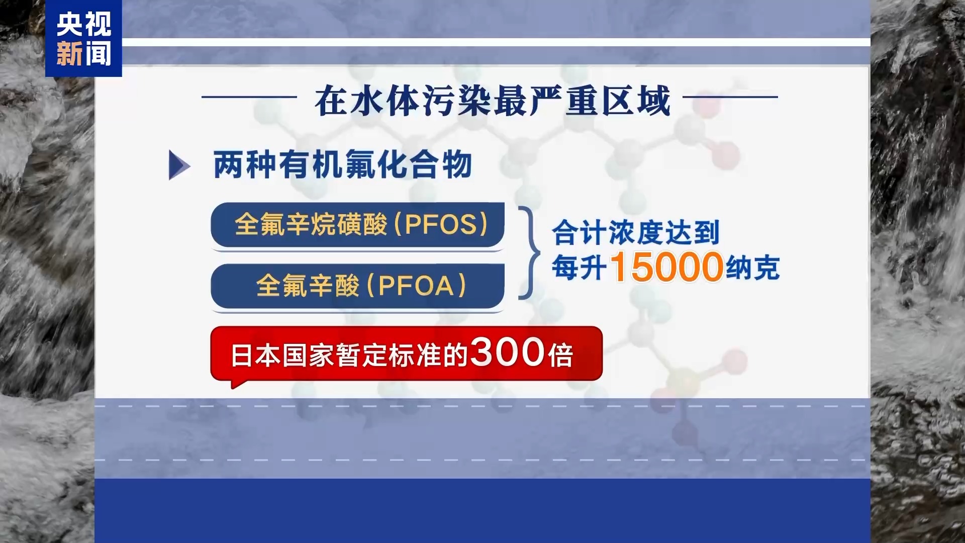 在水体污染最严重区域,两种有机氟化合物全氟辛烷磺酸(PFOS)和全氟辛酸(PFOA )合计浓度达到每升15000纳克,相当于日本国家暂定标准的300倍。而污染最严重的区域就在驻日美军基地的弹药库附近。