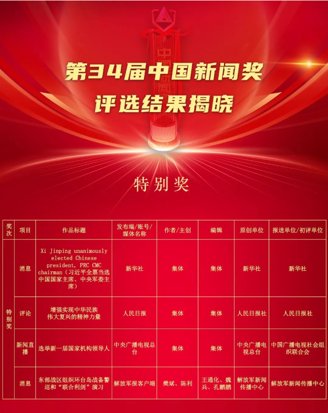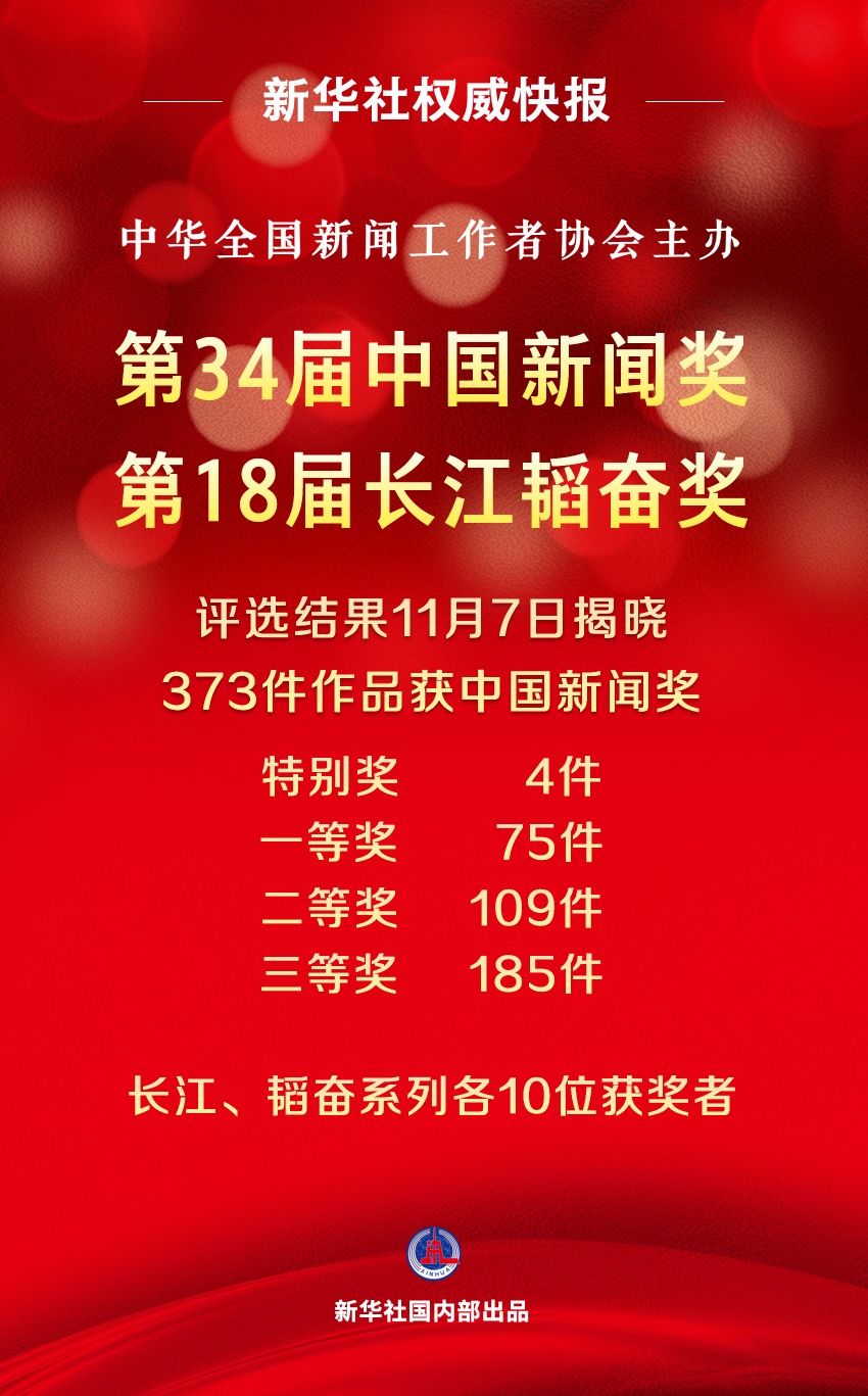 第34届中国新闻奖、第18届长江韬奋奖评选结果揭晓2024-11-07 12:59 阅读 新华社、中国记协 由中华全国新闻工作者协会主办的第34届中国新闻奖、第18届长江韬奋奖评选结果11月7日揭晓。 来自全国各级各类媒体的373件作品获中国新闻奖,其中,特别奖4件、一等奖75件、二等奖109件、三等奖185件。同时揭晓的还有长江韬奋奖,长江、韬奋系列各10位获奖者。 具体名单如下: 第34届中国新闻奖 第18届长江韬奋奖 长江系列(10人) (按姓氏笔画排序) 韬奋系列(10人) (按姓氏笔画排序) 编辑:陈笑笑 审核:李运辉 打开APP阅读全文