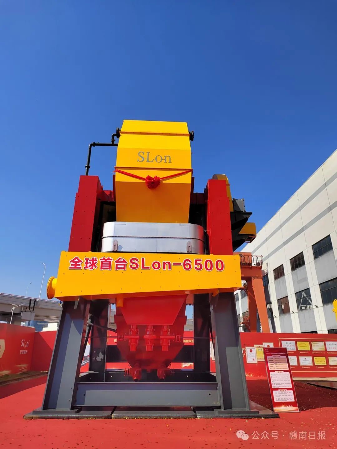 全球首台SLon-6500型立环脉动高梯度磁选机在章贡区金环磁选科技装备股份有限公司发布,SLon-6500型立环脉动高梯度磁选机,高12米、每小时选矿1500吨,实现了单台处理量最大,单吨耗能最低,选矿能效比最高。
