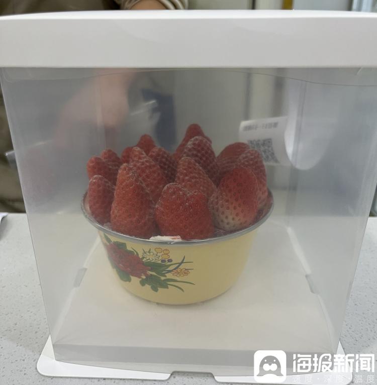 4日下午,记者来到位于济南市历下区和平路一家蛋糕店,刚进门就看到前台摆着两个已经包装好的搪瓷盆草莓蛋糕。