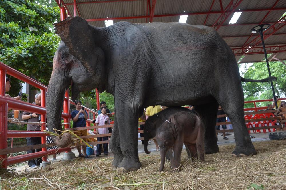 2024年6月10日在泰国大城府拍摄的母象与新生小象。