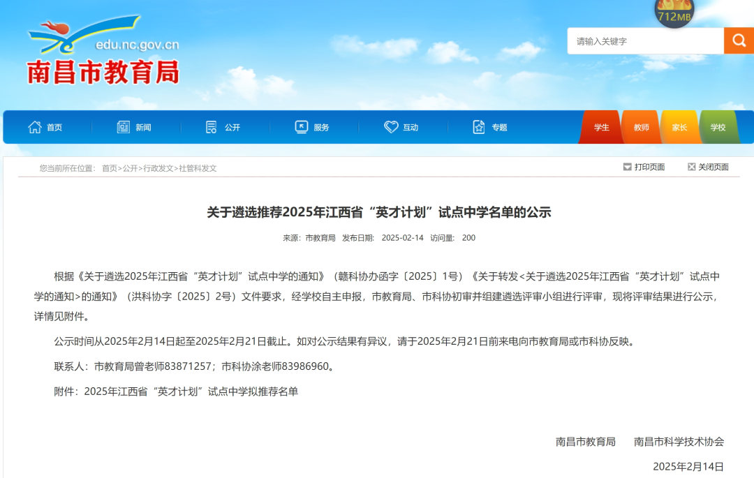 近日,南昌市教育局和市科协发布《关于遴选推荐2025年江西省“英才计划”试点中学名单的公示》,拟推荐南昌10所中学入选。南昌拟入选的中学分别是↓↓