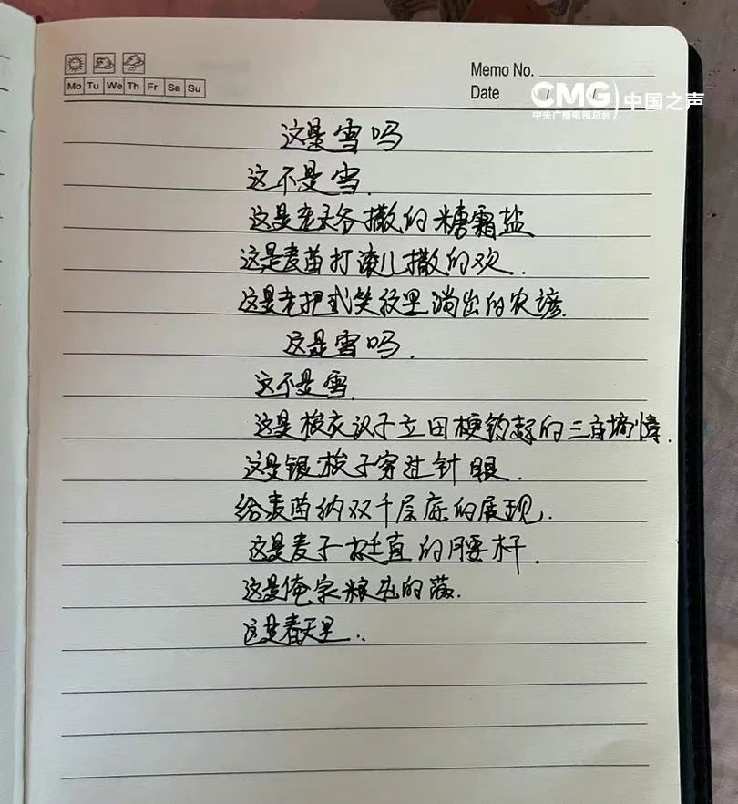 没有滤镜,没有美颜,视频里的“二姐”素面朝天,穿着最家常的小方格棉衣,右手托着一把刚下的春雪,笑盈盈地读着刚写完的诗。“我的家乡一个冬天都没下雪,一看下了雪,我说麦子有救了,麦子有救了呀!我躺在被窝里没起,就在那儿写。”一写完,吕玉霞裹上棉衣揣起手机就往雪地里跑,早饭都顾不得吃,“就怕雪化了”。
