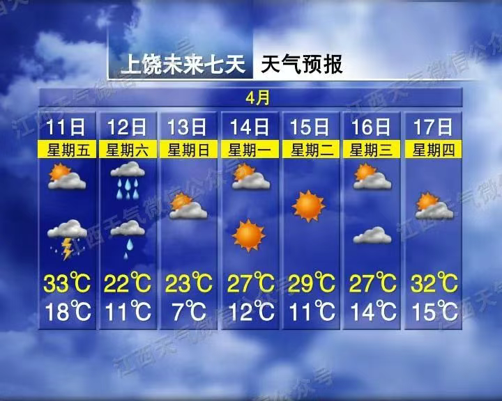 白天赣北北部多云转中雨或雷雨,局部地区有大雨;全省其他地区多云转阴,部分地区有阵雨或雷阵雨。晚上赣北、赣中、赣南北部阴天有中雨或雷雨,部分地区有暴雨,局部地区有大暴雨;赣南南部阴转阵雨或雷阵雨。明天最低温度:全省17~19℃,局部16℃。