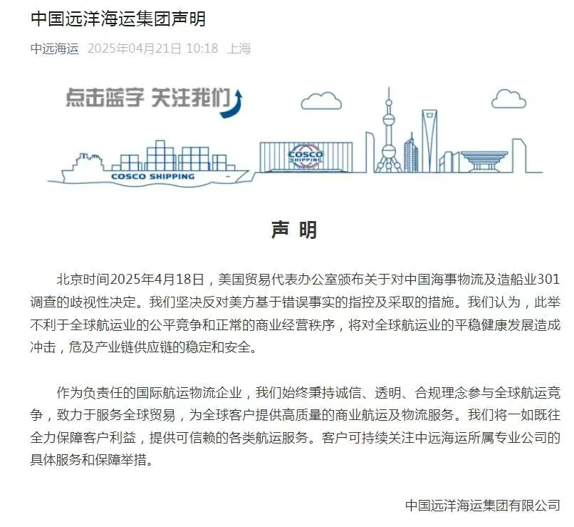 21日,中国远洋海运集团有限公司发表声明,全文如下: