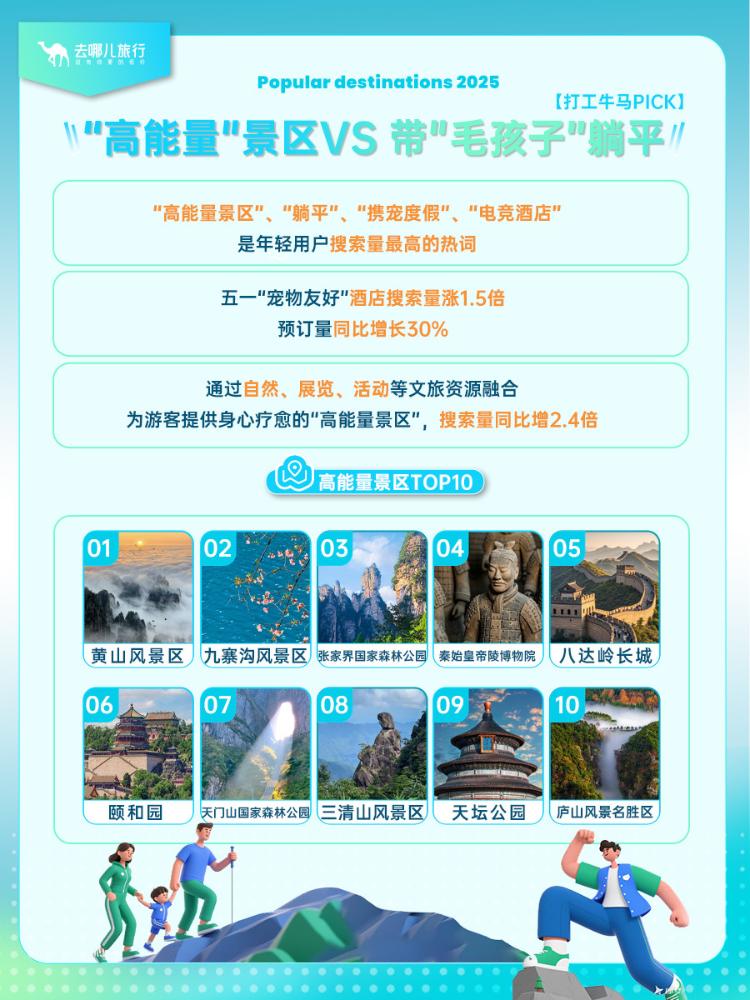 “高能量景区”从春天一直火到了五一,去哪儿平台上“高能量景区”搜索量同比增2.4倍。通过自然、展览、活动等文旅资源融合,为游客提供身心疗愈、灵感激发、活力释放等复合价值的景区,被年轻人形象地称为“高能量景区”,既包括森林氧吧等自然景点,也包括秦始皇帝陵博物院、颐和园这样充满“皇家风范”的景区。