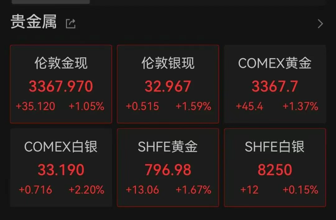 Wind数据显示,5月5日,现货黄金及COMEX黄金期货价格涨幅均一度超过2.7%,日内一度上涨超80美元。6日早间,现货黄金继续冲高,盘中一度突破3360美元/盎司。截至发稿,现货黄金报3367.970美元/盎司,COMEX黄金报3367.7美元/盎司,日内上涨均超1%。