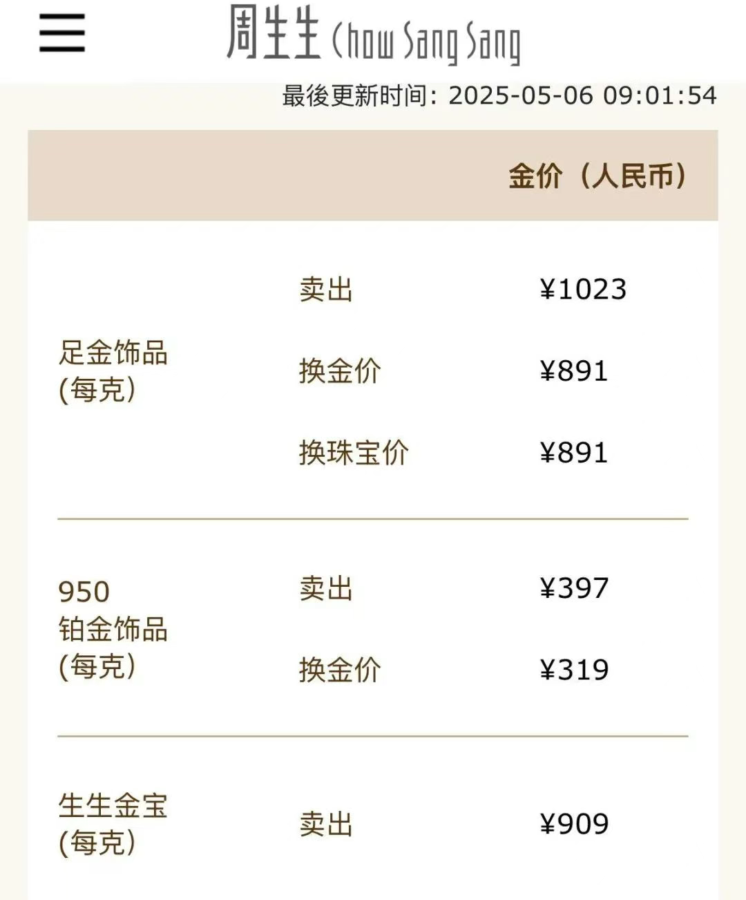 国内各品牌金饰价格也随之上扬,不少品牌克价再次突破千元。中新经纬6日查询发现,周大福金饰价格为1026元/克,较前一日上涨28元/克;周生生金饰价格为1023元/克,较前一日上涨23元/克;老庙黄金金饰价格为1022元/克,上涨31元/克。