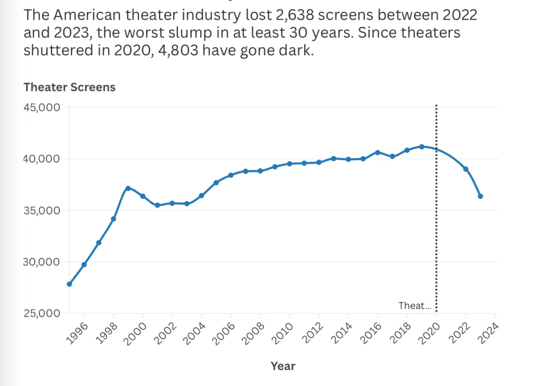 2022年至2023年间,美国影院损失了2638块银幕,这个趋势还在延续。