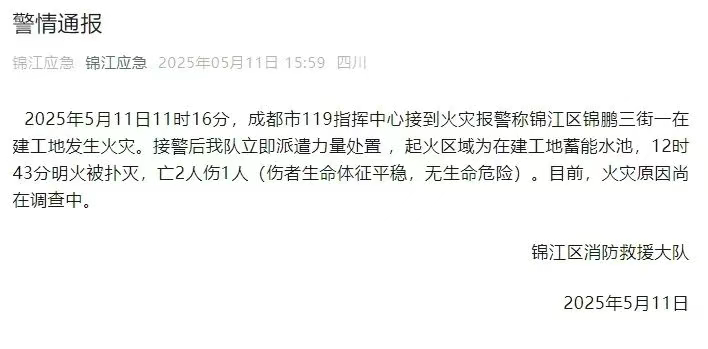 2025年5月11日11时16分,成都市119指挥中心接到火灾报警称锦江区锦鹏三街一在建工地发生火灾。接警后锦江区消防救援大队立即派遣力量处置 ,起火区域为在建工地蓄能水池,12时43分明火被扑灭,亡2人伤1人(伤者生命体征平稳,无生命危险)。目前,火灾原因尚在调查中。