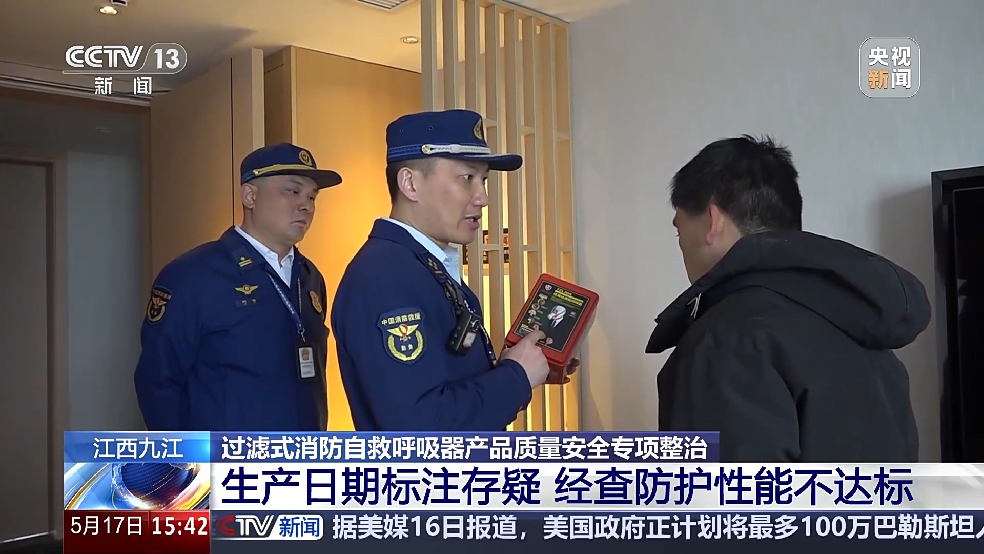 据了解,这家民宿共配备有这种过滤式消防自救呼吸器220多具,都是以每具22元的价格从网上购买。目前,消防部门已将所有不合格的过滤式消防自救呼吸器进行了收缴,并责令该场所重新配置合格产品。在湖北,记者跟随检查组人员对过滤式消防自救呼吸器的使用场所进行暗访时发现,一些防护面罩没有采用具有反光特性的材料或没有设置环绕头部一周的反光标志。除此之外,检查人员在对场所内配备的过滤式消防自救呼吸器的产品身份证标识、性能参数抽查检验时也发现了问题。