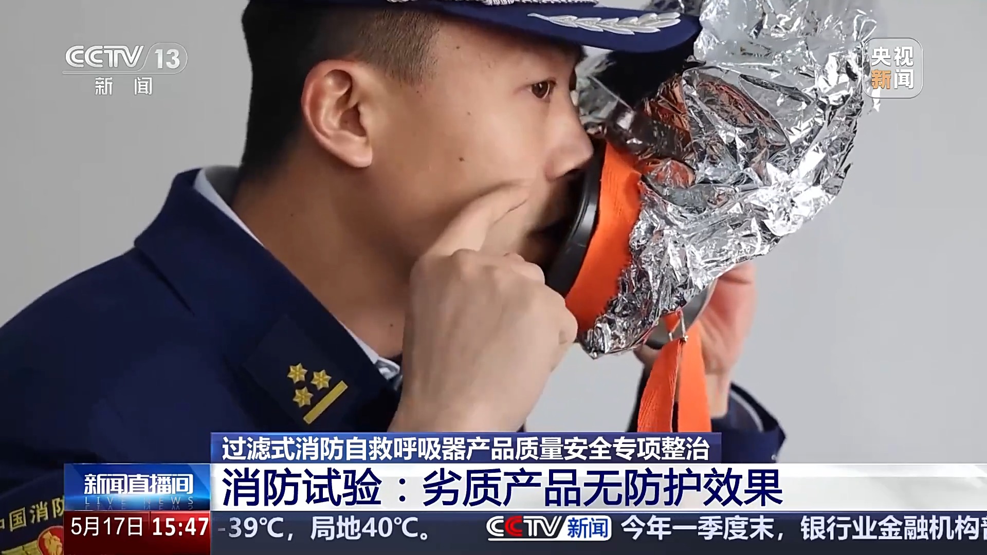 检查组除了实地走访检查,还强化了网络交易平台的问题排查整治,及时清理下架问题过滤式消防自救呼吸器产品,关停网络链接8000余条,下架问题产品5581批次。合格与不合格的过滤式消防自救呼吸器在使用时有多大差异?消防员在真烟真火场景下进行了试验。
