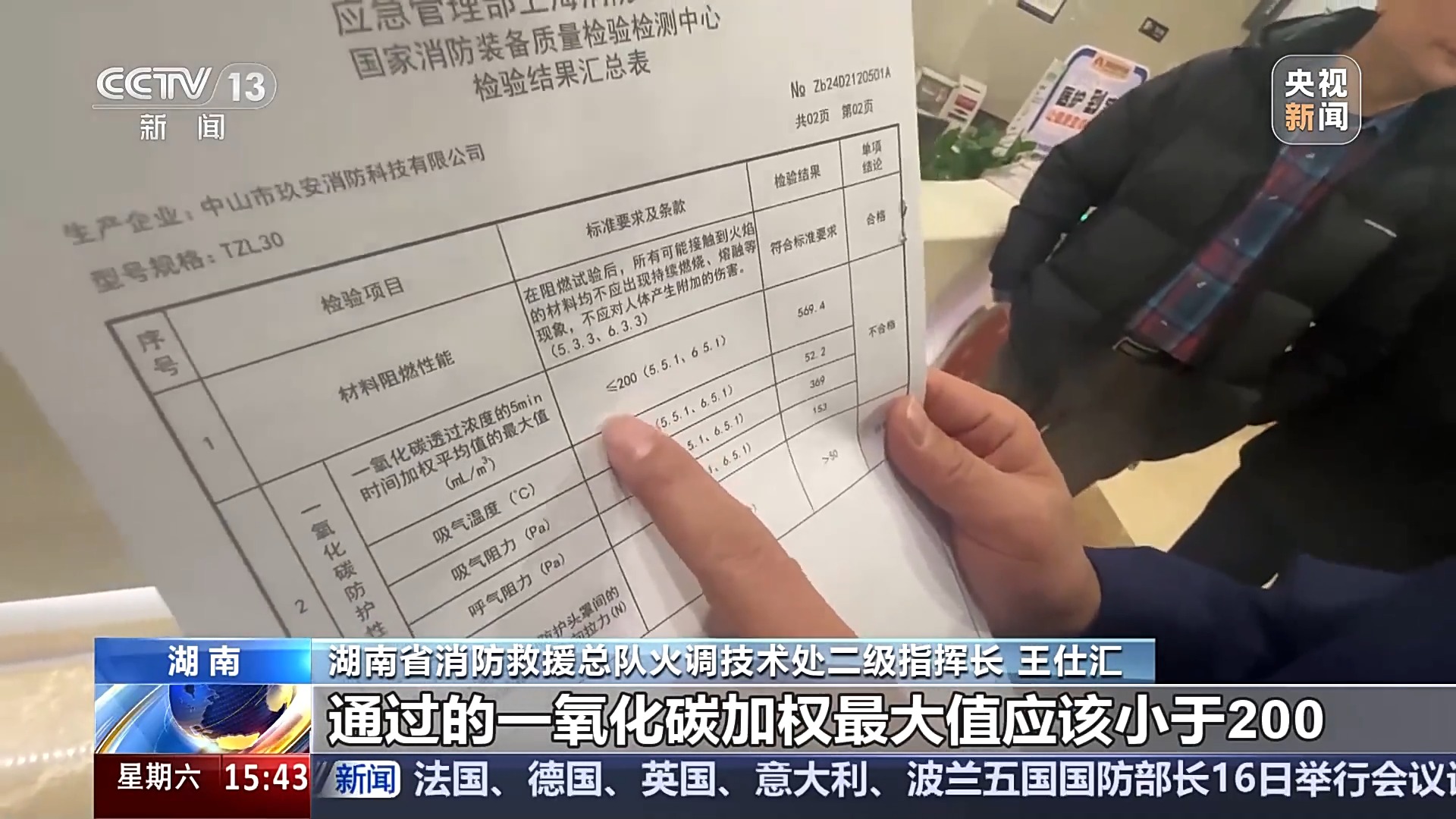 湖南省消防救援总队火调技术处二级指挥长 王仕汇:它的不合格内容主要是这个一氧化碳的防护性能,也就是正常的情况下通过的一氧化碳加权最大值应该小于200,但从我们检查的情况来看达到了569.4,严重超过了标准值,达不到有效防护以及过滤一氧化碳的作用。