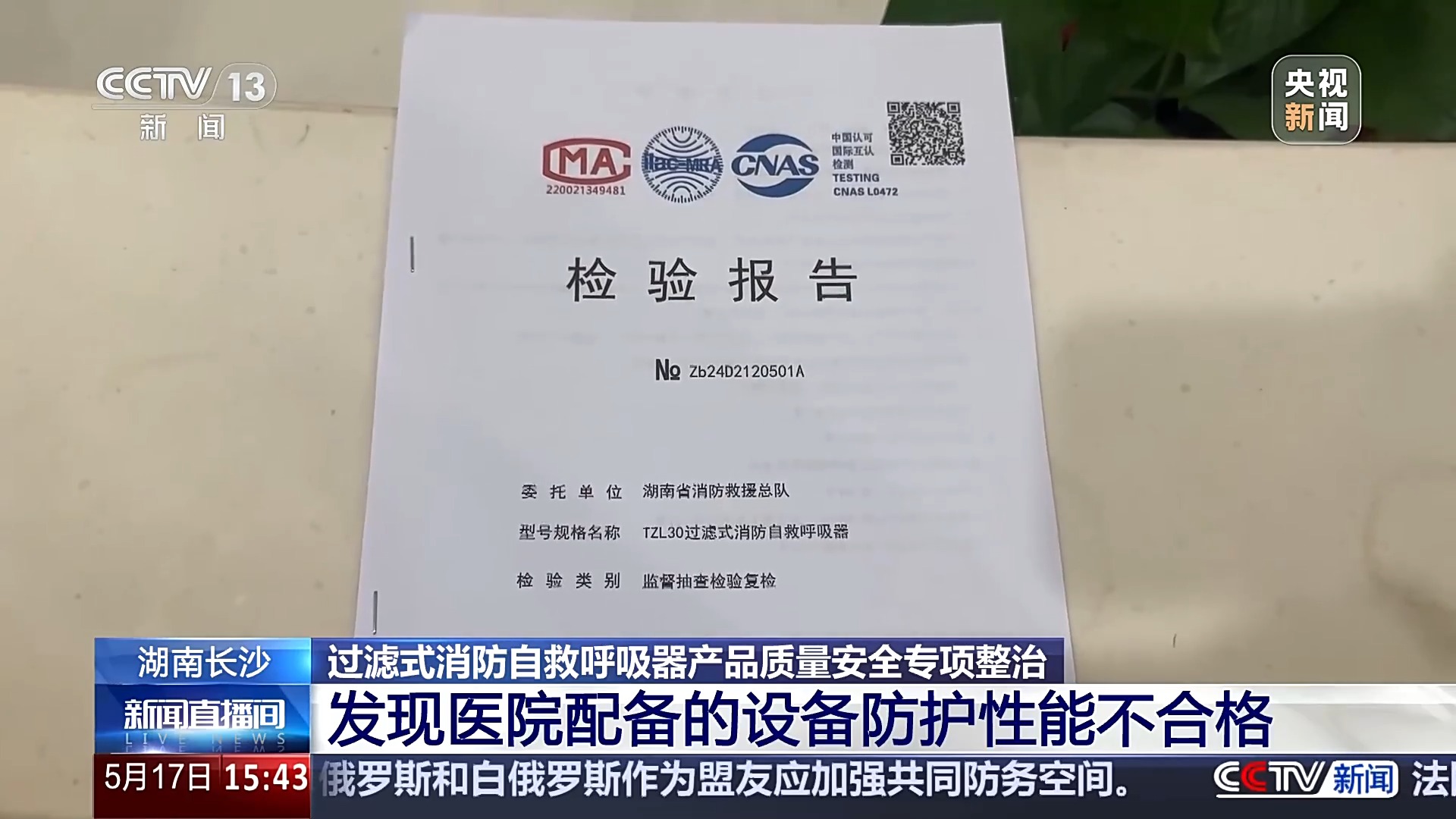 在湖南长沙的一家医院内,检查人员将过滤式消防自救呼吸器送去做质量抽检,检验报告显示,这家医院配备的过滤式消防自救呼吸器的防护性能不合格。