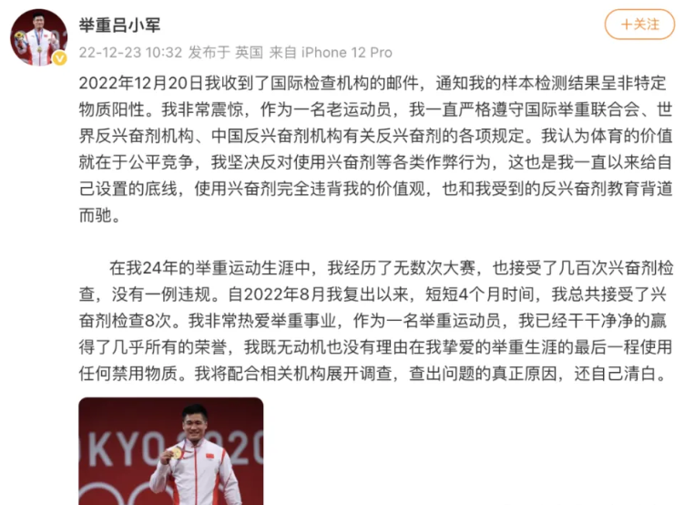 2022年12月,国际兴奋剂检测机构在官方网站发布公告,三届奥运会举重冠军得主吕小军暂时被禁赛,理由是在10月的一次赛外兴奋剂检测结果呈阳性。