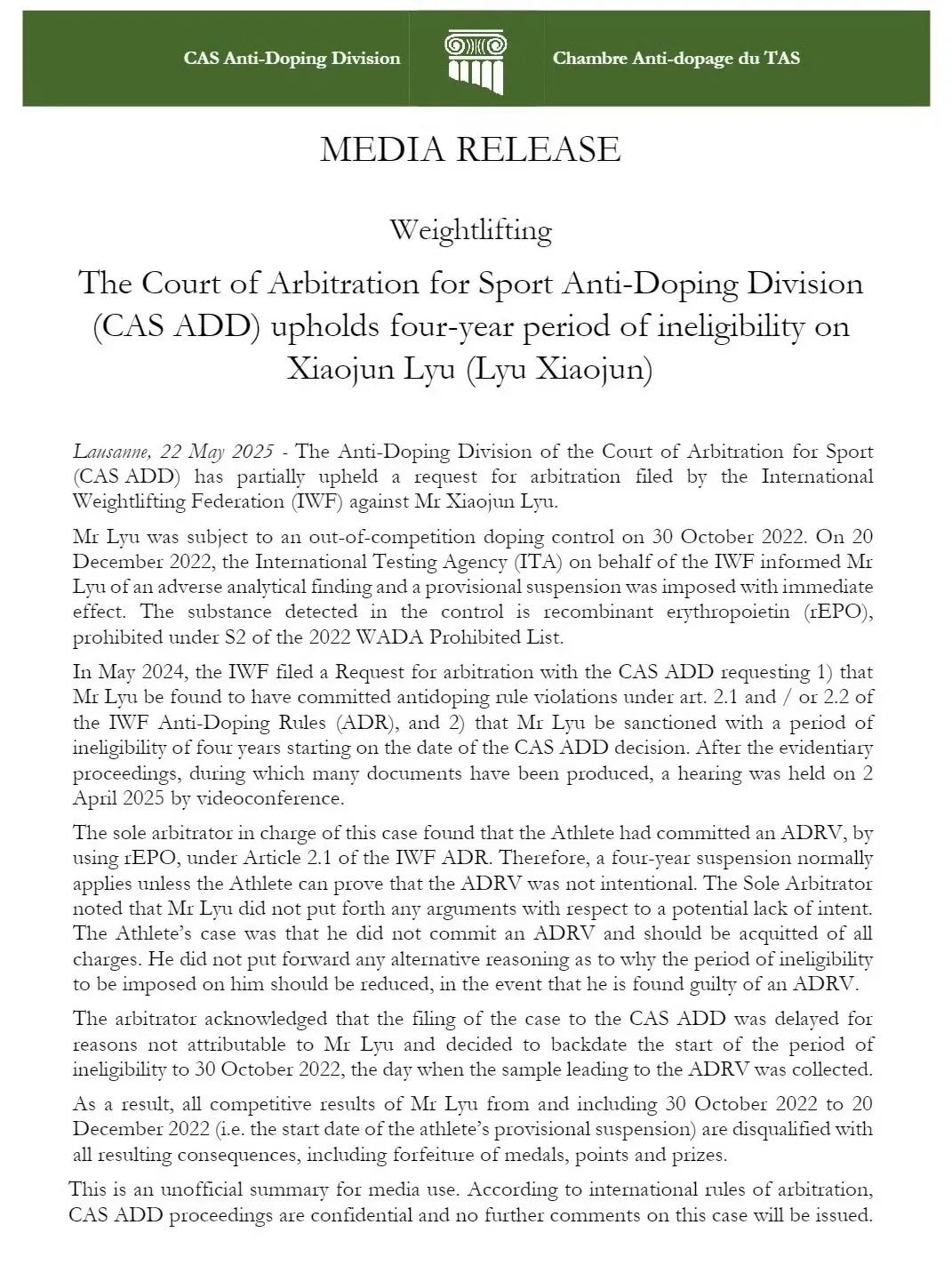 国际体育仲裁院反兴奋剂部门部分支持了国际举重联合会对吕小军先生提出的仲裁请求。
