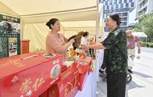 图为5月28日,商家带来活鸡向消费者介绍崇仁麻鸡的特点。
