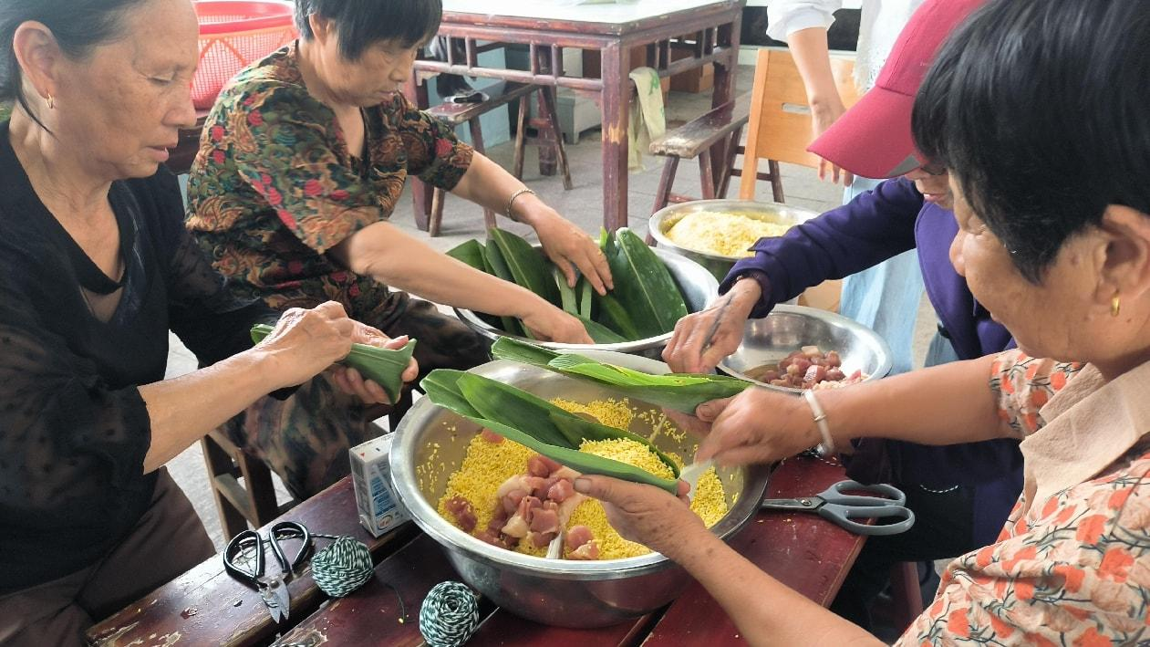 活动现场,糯米、粽叶、红枣等材料整齐摆放,工作人员与老人们围坐一团,共同体验包粽子的乐趣。捋粽叶、填馅料、扎绳结,一双双巧手上下翻飞,一个个饱满的粽子逐渐成形。染红蛋环节更是让老人们笑逐颜开,鲜艳的色彩传递着对健康长寿的美好祈愿。